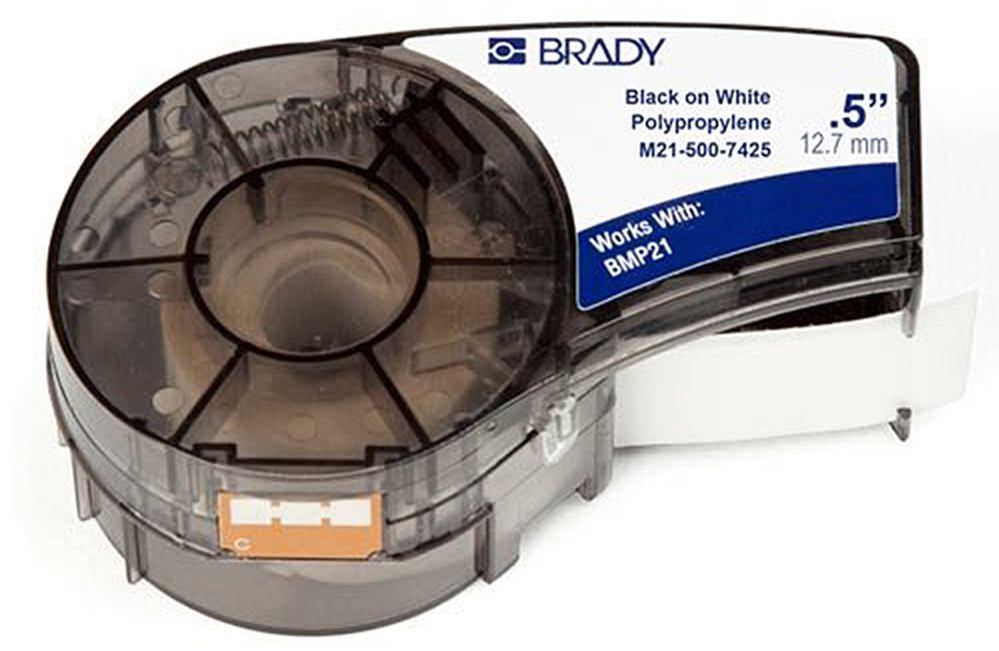 Материал Brady B-7425 поставляется в виде картриджа. В картридж установлен риббон необходимой длины и сам материал, на котором будет производится печать. Так как у принтера BMP21-Plus есть встроенный резак, оператор сам определяет длину напечатанной этикетки. Картридж снабжён микрочипом. Принтер BMP21 понимает какой картридж вставлен, в зависимости от этого меняется размер шрифта и уровень нагрева головки.