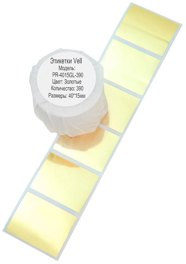 Универсальные этикетки в цвете золотой Vell PR-4015GL-390 поставляются в упаковке в количестве . Длина каждой этикетки равна 15, ширина - 40, форма изделия – прямоугольная. Модель изготовлена из синтетической бумаги, которая отличается стойкостью к износам, эластичностью, прочностью и гладкостью. Этикетки толщиной 140-150 мкрн, обладают высокой устойчивостью к химическим воздействиям и маслам, защищены от влаги и УФ лучей. Ленты разработаны для маркировки различных предметов, широко применяются в парфюмерии, различных лабораториях, а также для обозначения кабелей и проводов, товаров и создания ценников. Процесс наклеивания необходимо производить при температуре более 10°C, диапазон температуры эксплуатации от -20°C до 70°C.