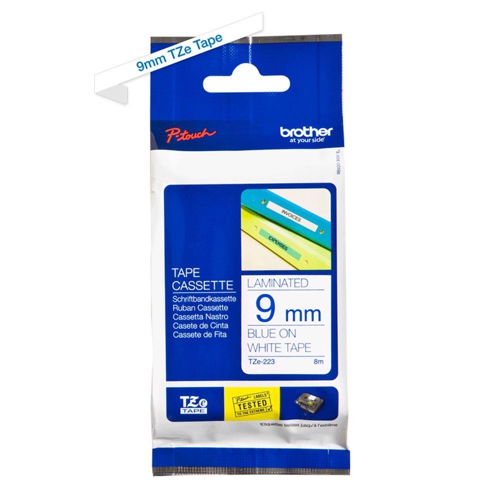 Плёнка для наклеек Brother TZE-223 синий шрифт на белой основе, 9мм*8м