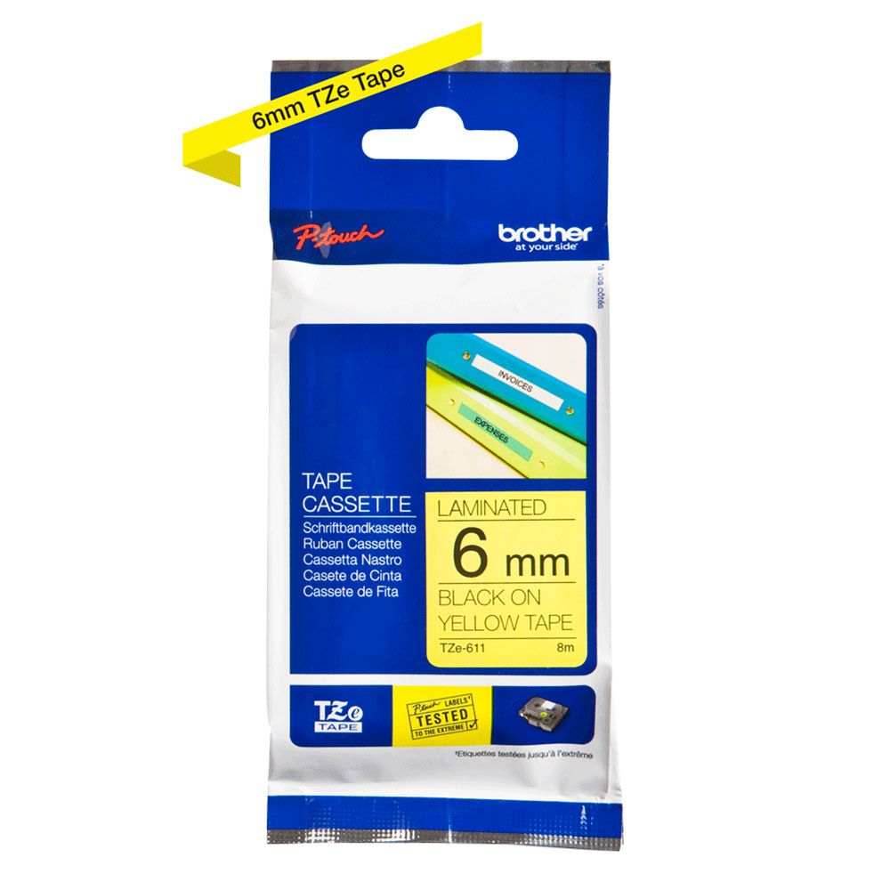 Плёнка для наклеек Brother TZE-611 чёрный шрифт на жёлтой основе, 6мм*8м