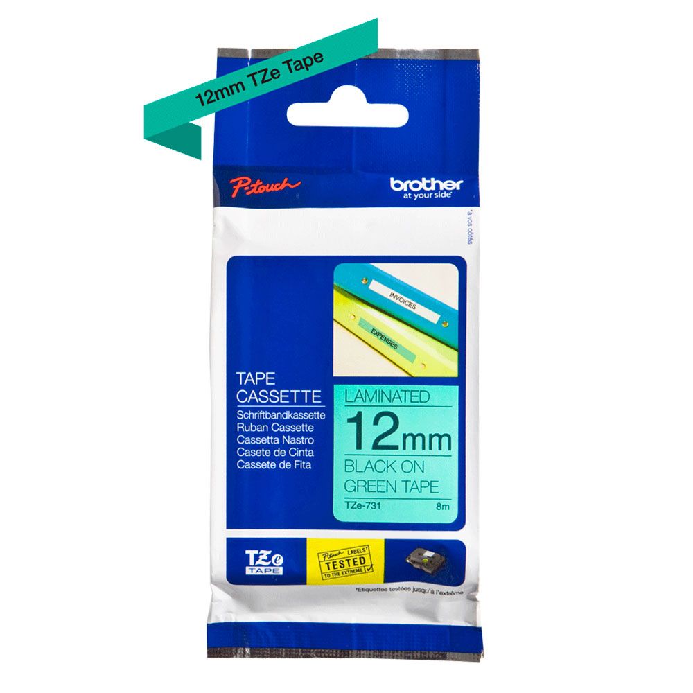Плёнка для наклеек Brother TZE-731 чёрный шрифт на зелёной основе, 12мм*8м