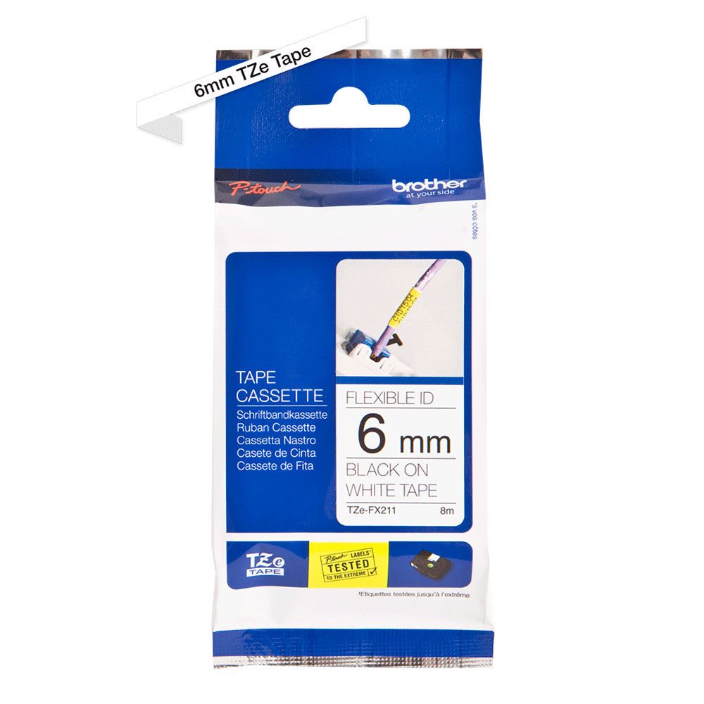 Плёнка для наклеек эластичная Brother TZE-FX211 чёрный шрифт на белой основе, 6мм*8м